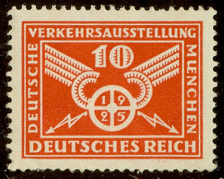 On 1925, Germany issued a stamp with a bold art deco design of a traffic wheel image. The stamp was issued in commemoration of the Deutsche Verkehrausstellung München 1925 or Munich Transport Exhibition of 1925. 9 years later, Germany issued another stamp with an art deco design with an image of two hands grasping a piece of coal, which refers as the Saar Plebiscite.